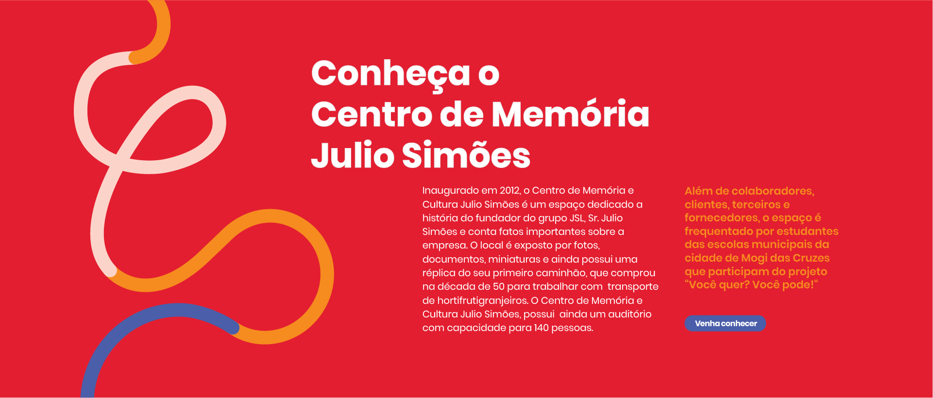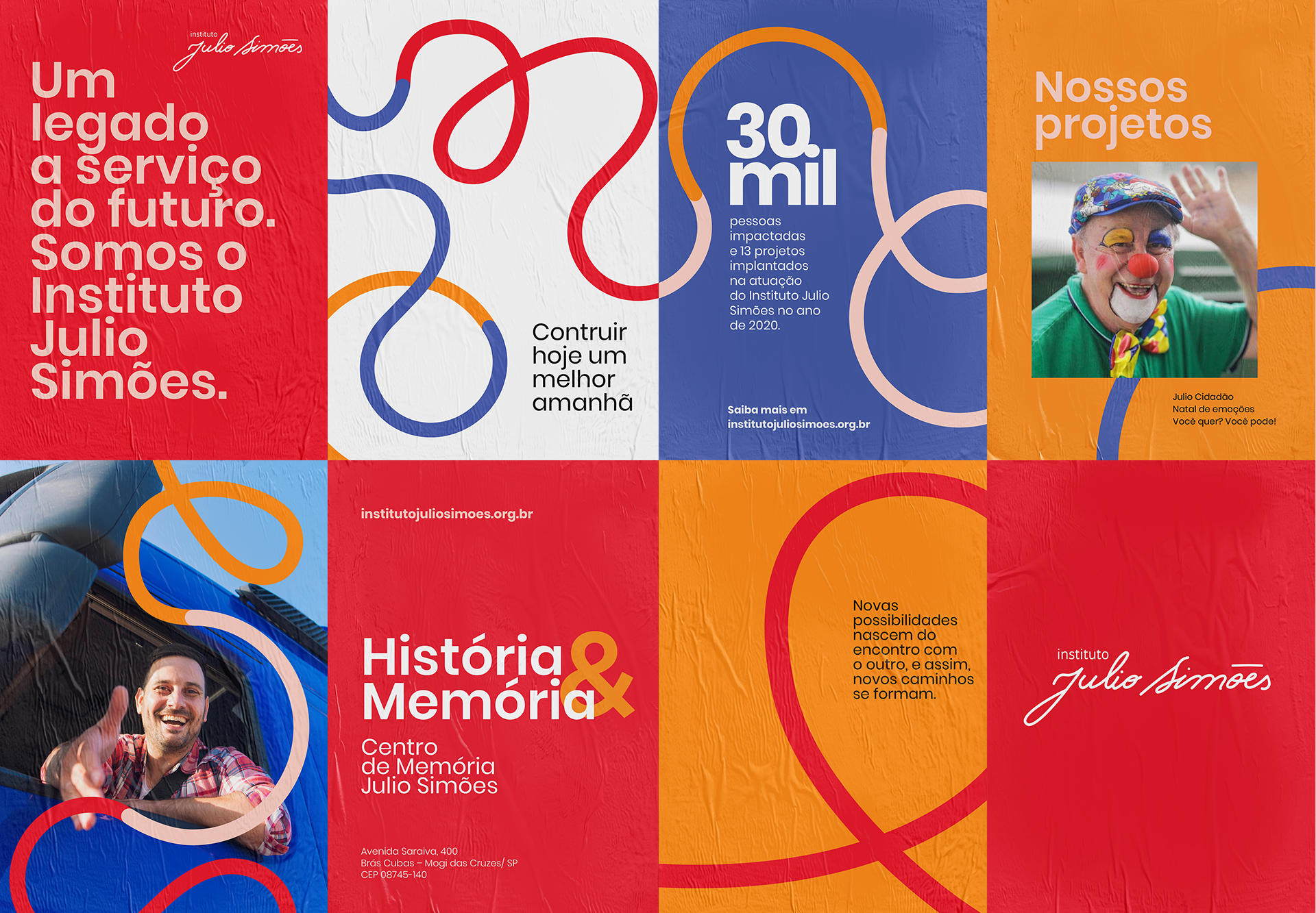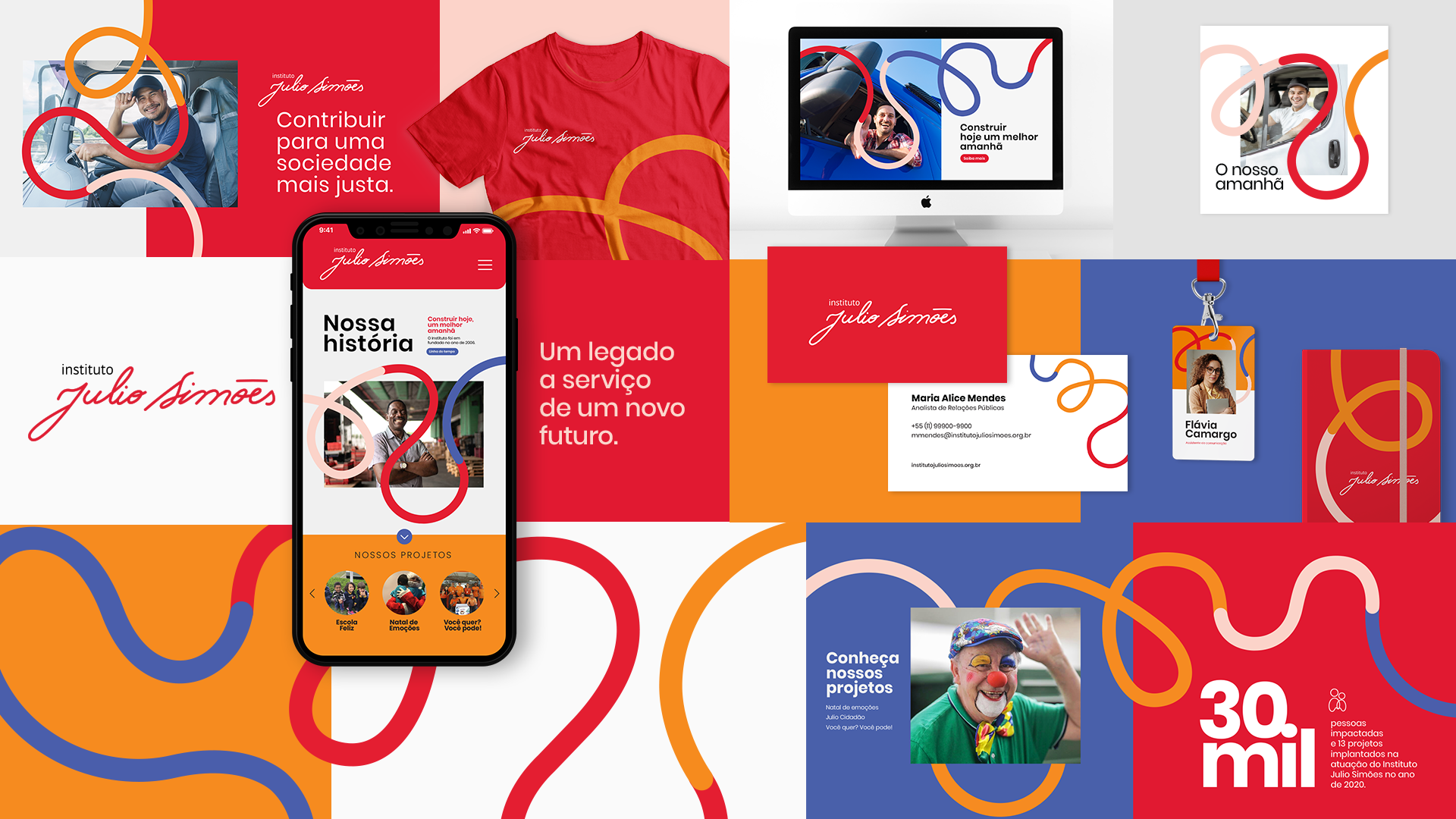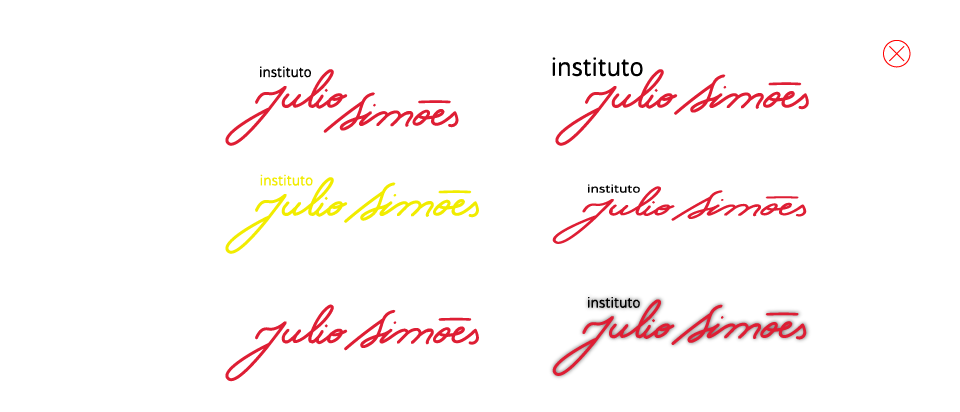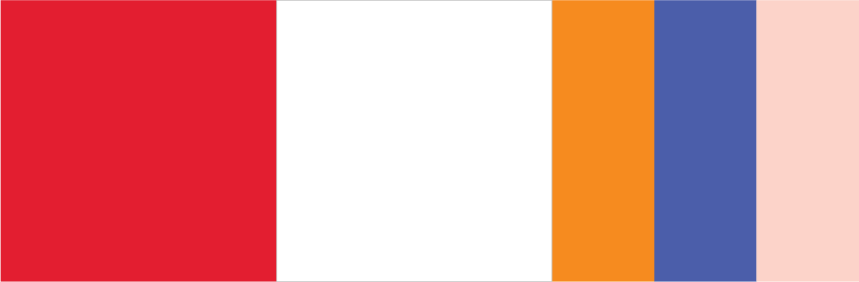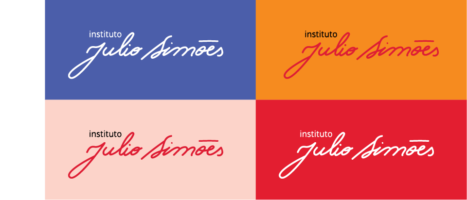 A cor é uma das principais ferramentas para expressar a identidade do Instituto Julio Simões. As principais cores da identidade são o vermelho e o branco. Para compor uma paleta flexível, acrescentamos o laranja, o azul e o rosa como cores de apoio a serem utilizadas em detalhes das composições.
